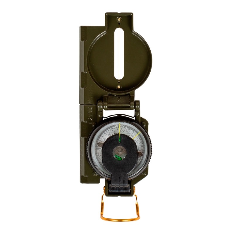Специальная металлическая скоба позволяет не только комфортно держать и переносить компас, но и устанавливать его на горизонтальной поверхности. По обеим сторонам прицельной нити расположены светящиеся точки для комфортной использования в темное время суток.