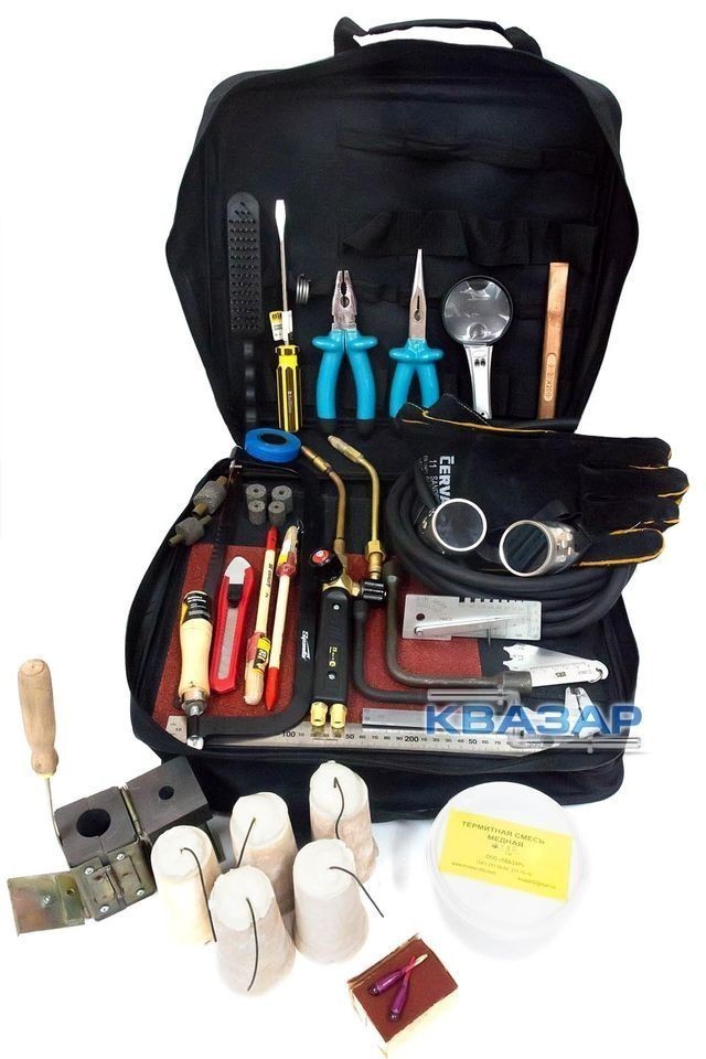 Комплект включает в себя: термитную смесь, одноразовую и многоразовую тигель-форму, термопатроны и термошашки, очки сварщика, лупу с подсветкой, плоскогубцы, тонкогубцы, гаечный ключ, отвертки, шаблоны сварщика, металлическую линейку, напильники плоские, слесарный молоток, горелку с рукавом, плавкий пруток, зубило омедненное.