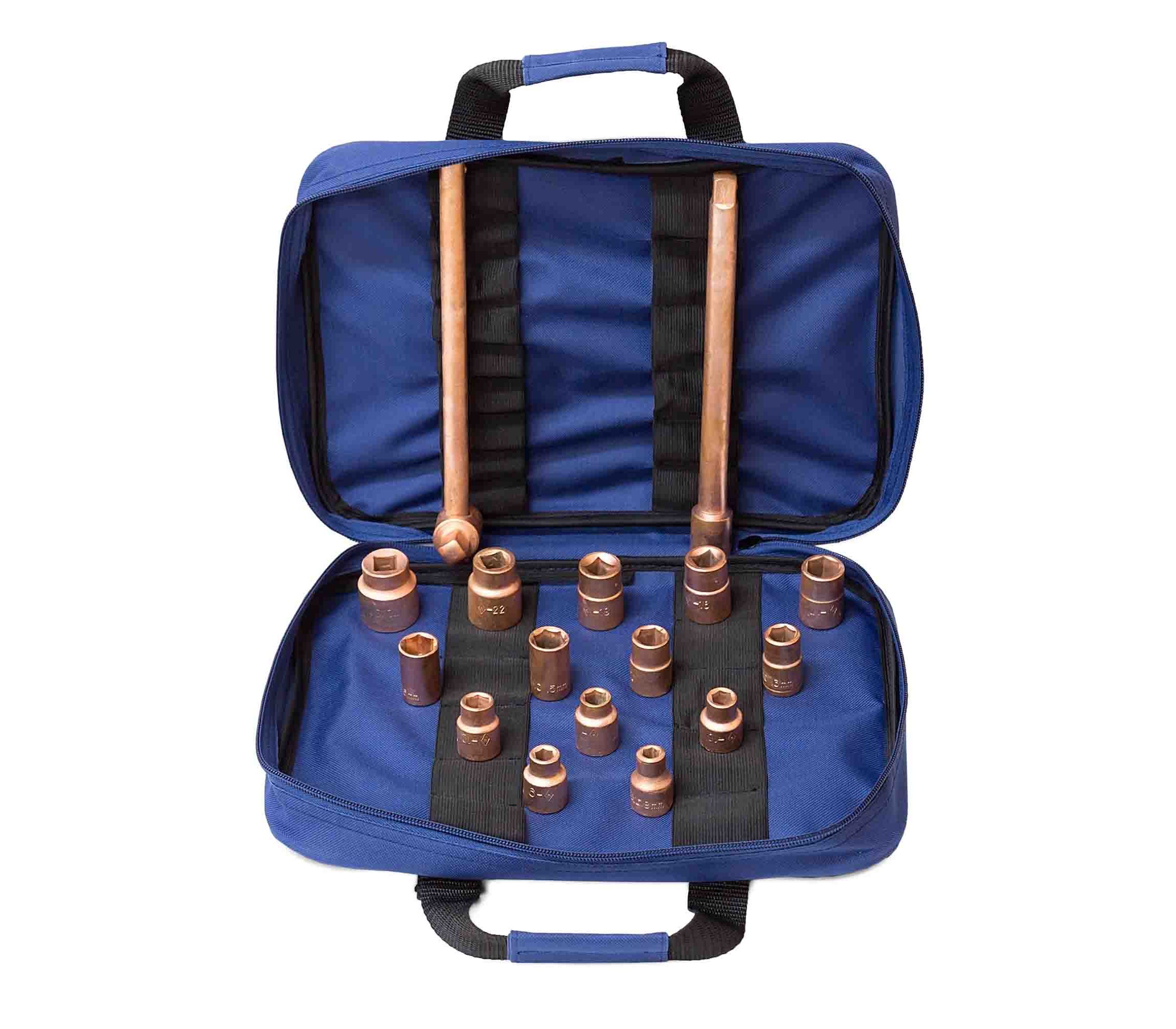 Комплект искробезопасных головок позволяет осуществить ремонтные работы без угрозы жизни и имуществу, так как весь инструмент покрыт гальваническим слоем меди толщиной не менее 30 мкм. При выполнении сложных и опасных производственных задач, медный слой предотвращает появление искр – он всего лишь деформируется.
