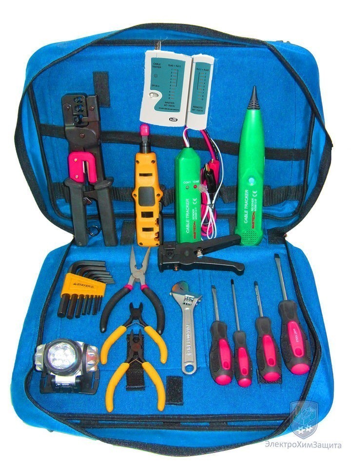 Набор включает в себя как измерительные приборы, позволяющие определить наличие напряжения на линии и протестировать оконцованный коннекторами RJ-45, RJ-11, RJ-12 кабель на наличие дефектов и неисправностей, так и широкий спектр ручного инструмента, предназначенного для: