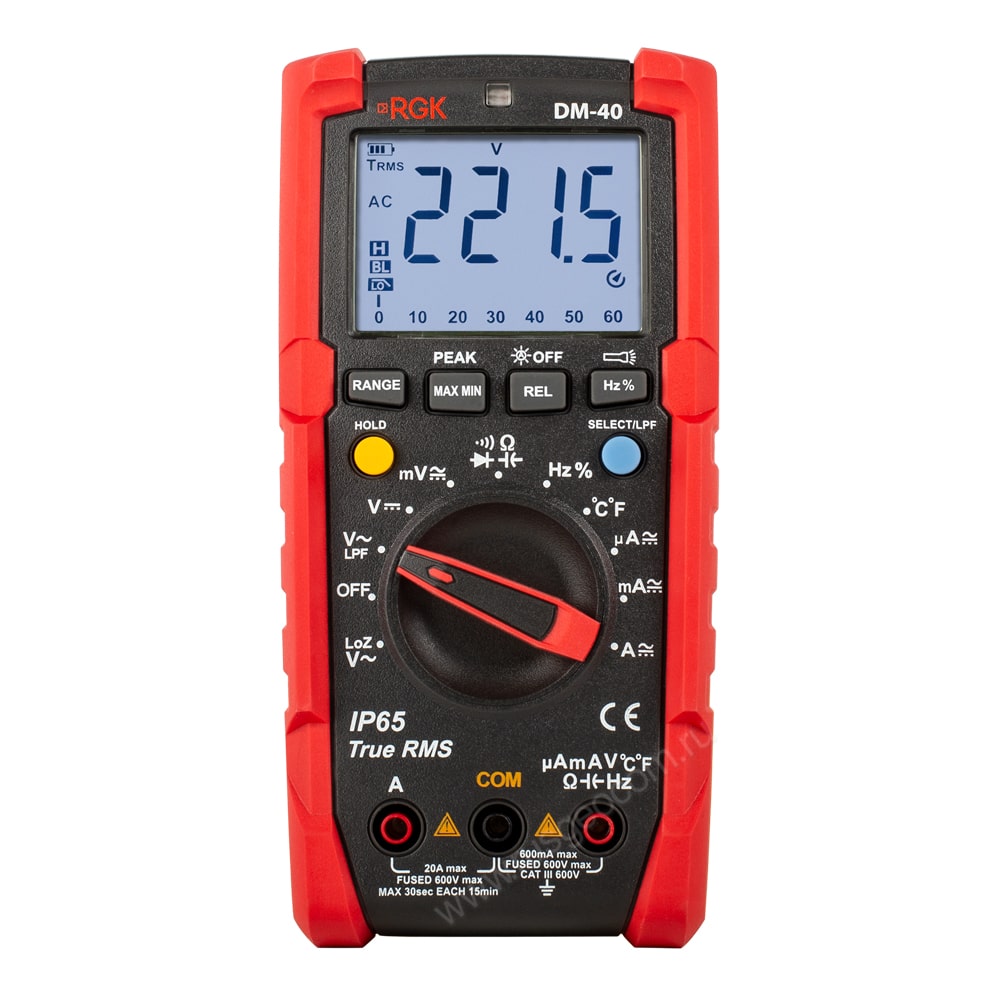 Многофункциональный мультиметр RGK DM-40 соответствует стандарту CAT III 600В, благодаря чему может применяться для диагностики коммутационного оборудования, распределительных щитов и других элементов электросетей. Встроенные предохранители, изоляция разъемов и светозвуковая сигнализация, защищают устройство от перегрузки и непредвиденных скачков напряжения вплоть до 6 кВ. Защита корпуса от попадания пыли и проникновения капель воды соответствует классу IP65. Падения с высоты до 2 метров не сказываются на работоспособности приборы.
