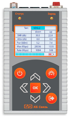 Измерение в цикличном режиме и вывод на экран дисплея в табличной форме следующей информации | технология соединения; максимальная скорость; достигнутая скорость; затухание в линии; запас помехоустойчивости – соотношение сигнал/шум SNR; выходная мощность; |