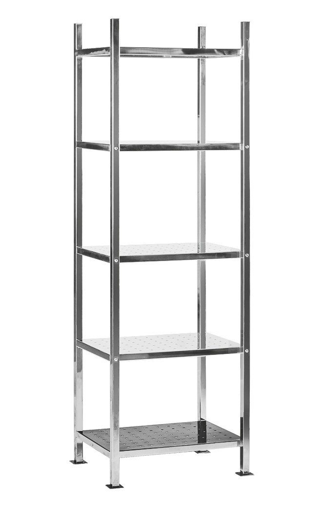 Стеллаж в стандартной комплектации имеет 5 полок с перфорацией горизонтальных поверхностей.