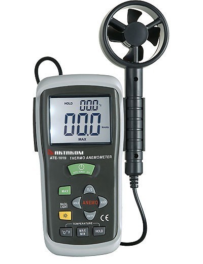 Портативный крыльчатый анемометр с возможностью измерения температуры. В приборе использован выносной датчик (крыльчатка), снабженный подвеской на шарикоподшипниках с малым трением и обеспечивающий быстрое и точное дистанционное измерение скорости воздушного потока, его температуры и мгновенную индикацию на ЖК-дисплее. Прибор отображает измеренные значения во всех принятых единицах измерения (м/с, км/ч, футы/мин, узлы).